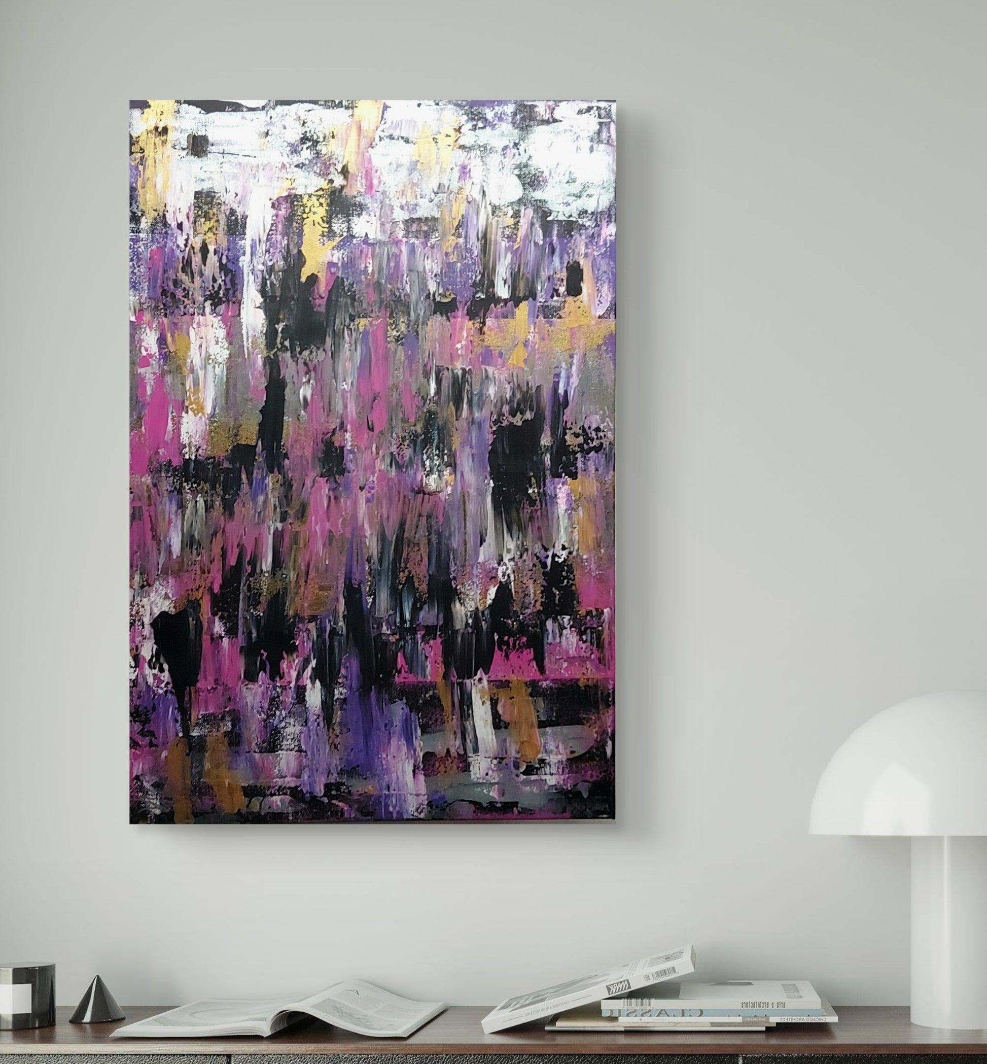 Original Leinwandbild, abstrakt, 50x70 cm, Leinwandbild auf Keilrahmen, Premium Acrylfarben in lila/Pastellfarben und Schimmerlook. Farbenmix u.a.mit lila, gold, weiß, grau und roten Akzenten. einmal vorrätig, Versand nur innerhalb Deutschland und nach Österreich.